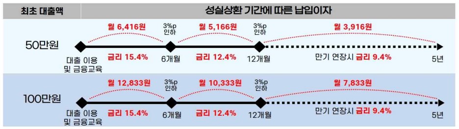 긴급생계비 대출의 금리 연 15.9%입니다. 높은 금리에 실망하셨을수도 있는데요. 하지만 연체없이 성실히 이자를 잘 상환할 경우 최저 9.4%까지 금리가 낮아집니다. 처음 대출시 15.9%가 적용되고 성실 상환 되면 6개월 주기로 금리가 연 3%포인트 씩 낮아지게 됩니다.